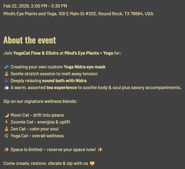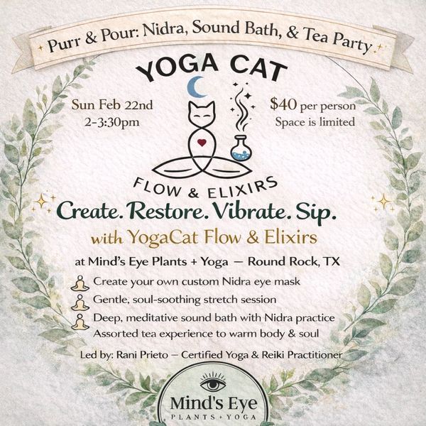 I'll guide you through a gentle moon salutations yoga flow class + Savasana sound bath + unwind with a relaxing tea in a beautiful relaxing space at Mind's Eye Plants + Yoga downtown Round Rock (I'm an independent guest instructor and not affiliated with Mind's Eye Plants)